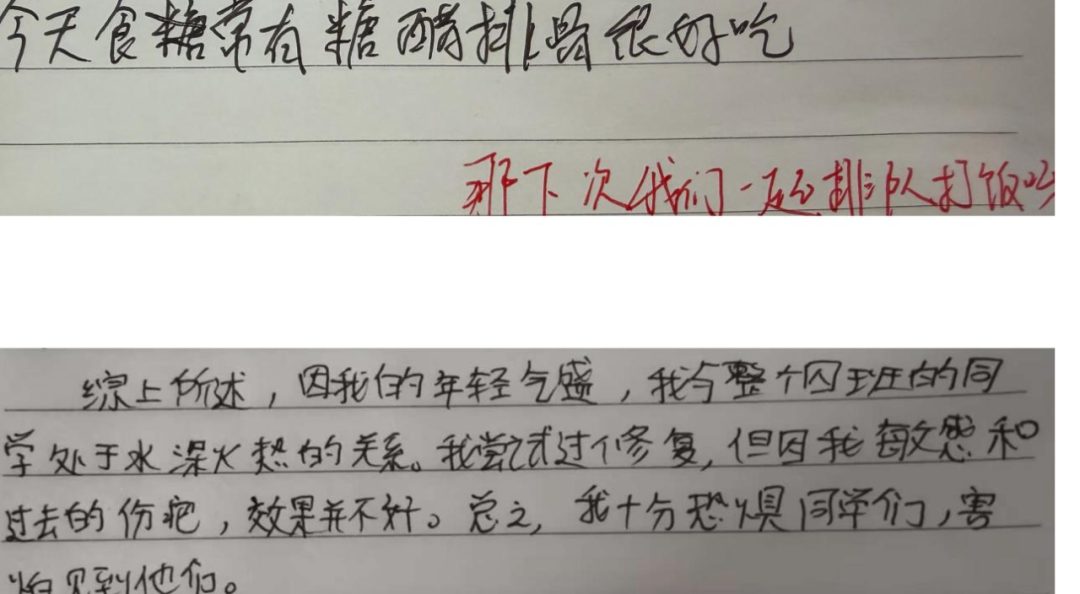 张月借班级复盘本的契机,悄悄在男孩课桌里放了一本专属本子,并附纸条:“如果今天有开心或值得纪念的事,写一点在这里吧。” 一周后,本子出现在张老师办公桌,仅一行字:“今天食堂有糖醋排骨,很好吃。” 张月立刻回复:“下次我们一起排队打饭呀!” 此后,这本本子成为师生间的秘密纽带,男孩渐渐倾诉集体生活的困境,张月耐心回应、谈心,引导他慢慢适应集体。
