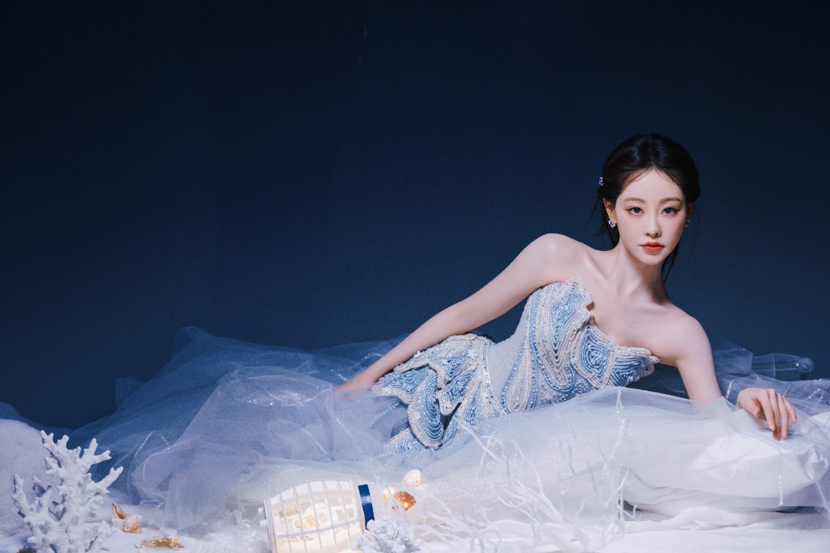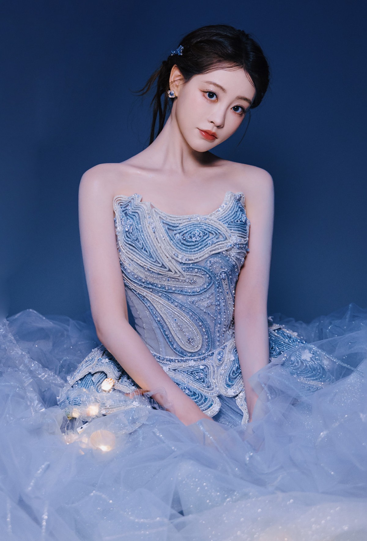 妆容更是细节控狂喜!底妆清透到发光,皮肤状态好到让人怀疑她是不是偷偷喝了海水精华。眼妆用淡蓝打底,再叠一层银白细闪,眼尾微微上挑,像极了人鱼跃出水面那一瞬的灵动弧线。睫毛又长又翘,在眼下投出若隐若现的阴影,让眼神既澄澈又深邃,仿佛能一眼望穿海底两万里。唇色选了柔雾感的红棕,不抢戏却恰到好处地中和了整体的冷调,悄悄塞进一丝人间烟火气。耳畔碎钻耳钉和发间的蓝水晶发饰在光影里轻轻晃动,每一帧都在说:这位深海公主,不仅梦幻,还很贵!
